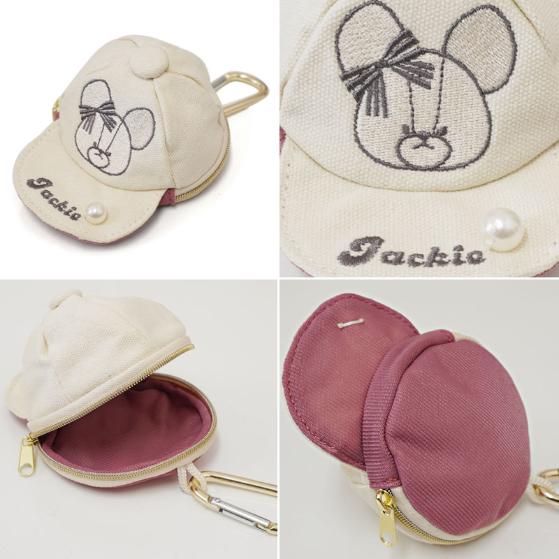 ジャッキーのワッペンがついた可愛いキャップ型ポーチ。つばに付いているパールビーズもアクセントに☆