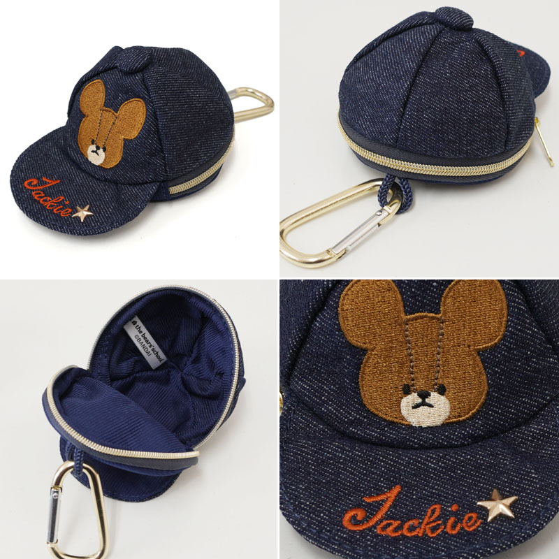 ジャッキーのワッペンがついた可愛いキャップ型ポーチ。デニム素材に星のスタッズもアクセントに☆