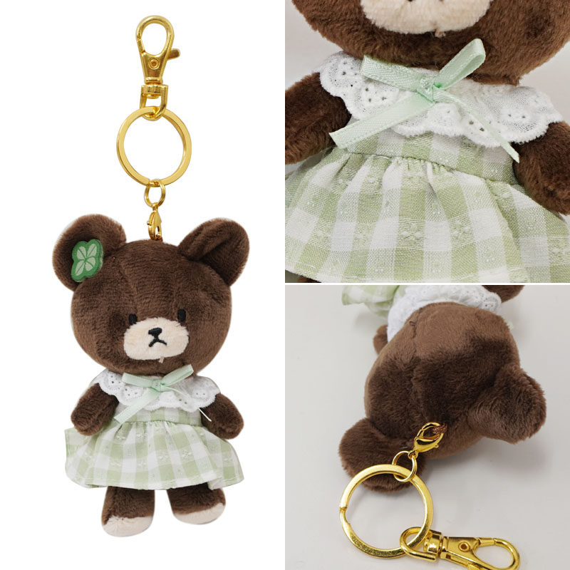 さわやかなグリーン色のギンガムチェックのワンピースが目を惹く可愛いマスコット。右耳のクローバーの飾りも可愛い☆