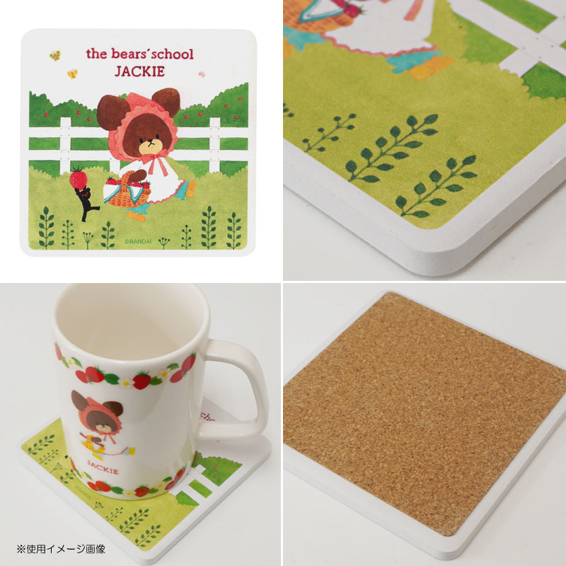 いちごみたいなずきんがおちゃめなジャッキーのイラストがかわいい角型コースター。給水性の高い素材でコップの水滴をしっかり吸い取ってくれます。裏面はテーブルを傷つけにくいコルク仕様で◎