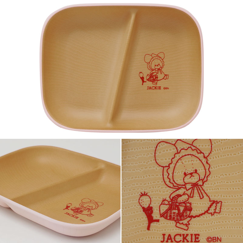 ジャッキーとイチゴのイラストがかわいい木目調のランチ皿。人気のカフェ風ごはんやテーブルを演出するパーティーにも活躍してくれそう! 軽くて丈夫な素材でできているのでお子さんにも安心です。