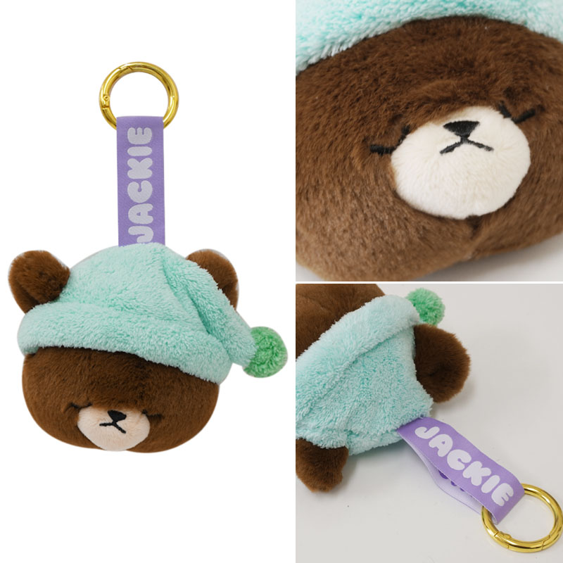 眠ったジャッキーのお顔が可愛い顔型マスコット。カラビナ付きでバッグのアクセントなどファッション小物として☆